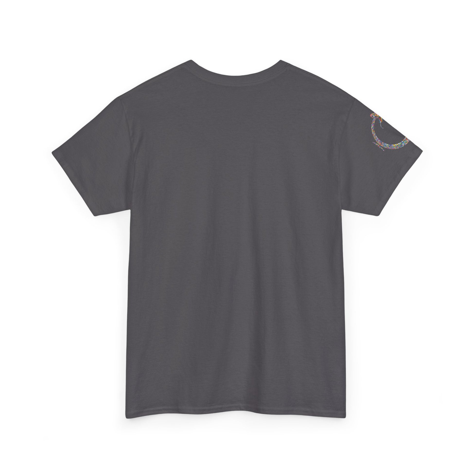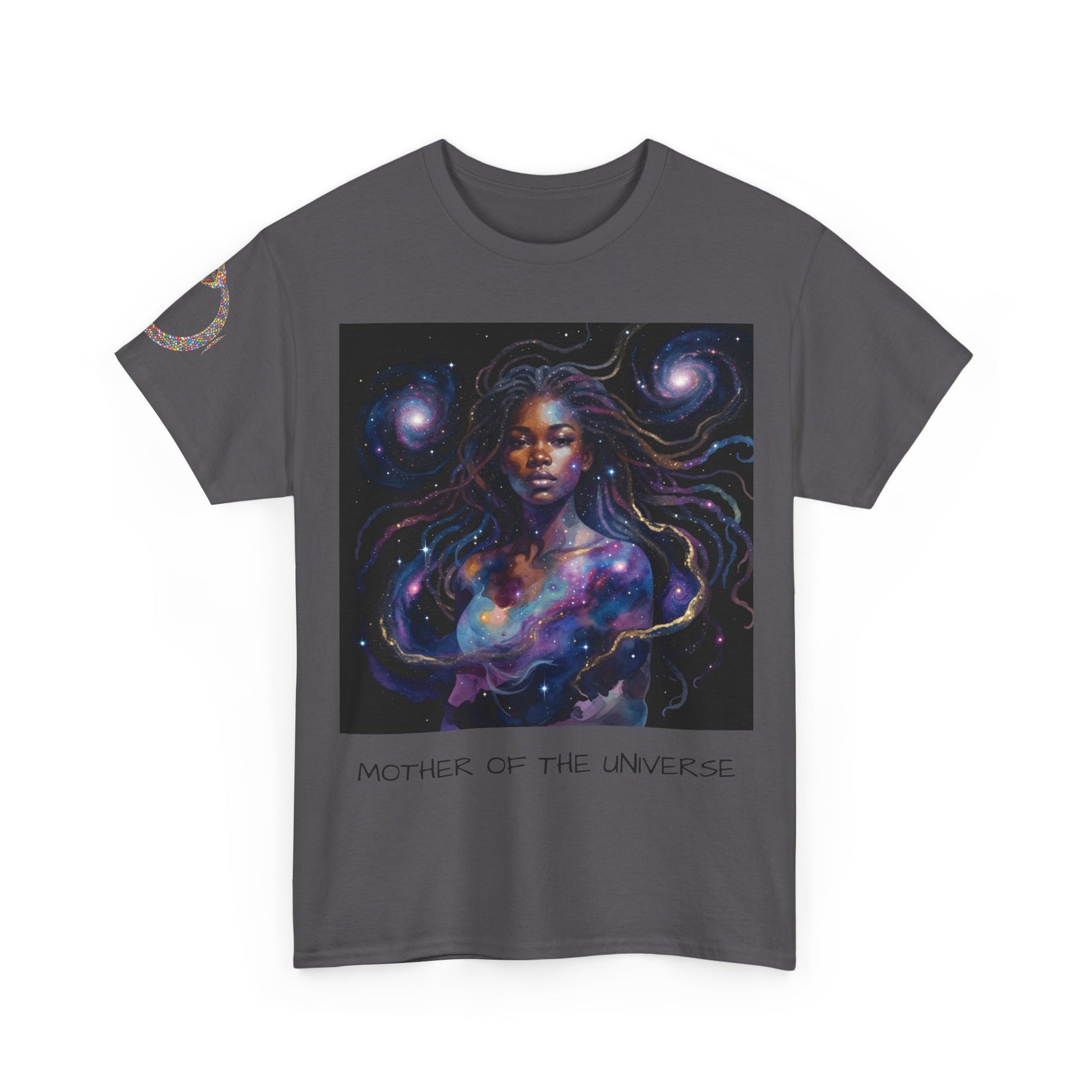 This relaxed-fit cotton tee carries a quiet, celestial energy. A serene portrait of a woman woven from galaxies and stardust sits at the chest, colors bleeding into nebulous blues, purples, and soft golds. It feels like wearing a night sky you can touch — comforting, contemplative, and quietly bold. The medium-weight fabric and classic crew neckline keep the silhouette familiar and approachable, while the gallery-style print invites lingering looks and conversation. Wear it on slow studio days, night walks under city lights, or layered with a denim jacket when you want your outfit to whisper something soulful.